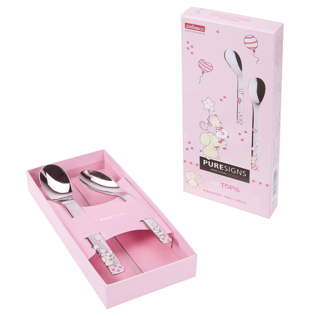 Das Babybesteck in rosa oder blau eignet sich ideal als Taufgeschenk, zur Geburt oder zu jedem anderen Anlass.